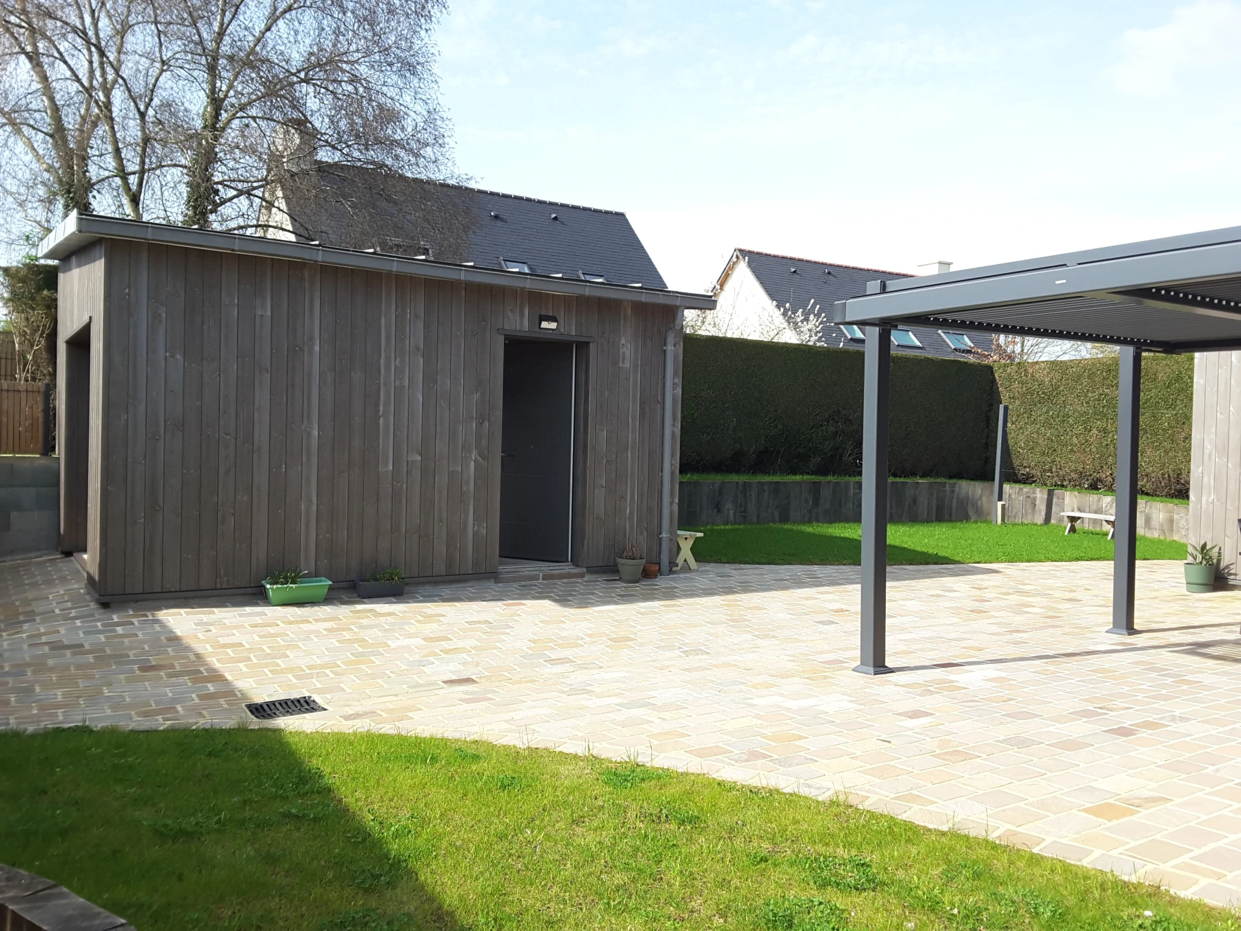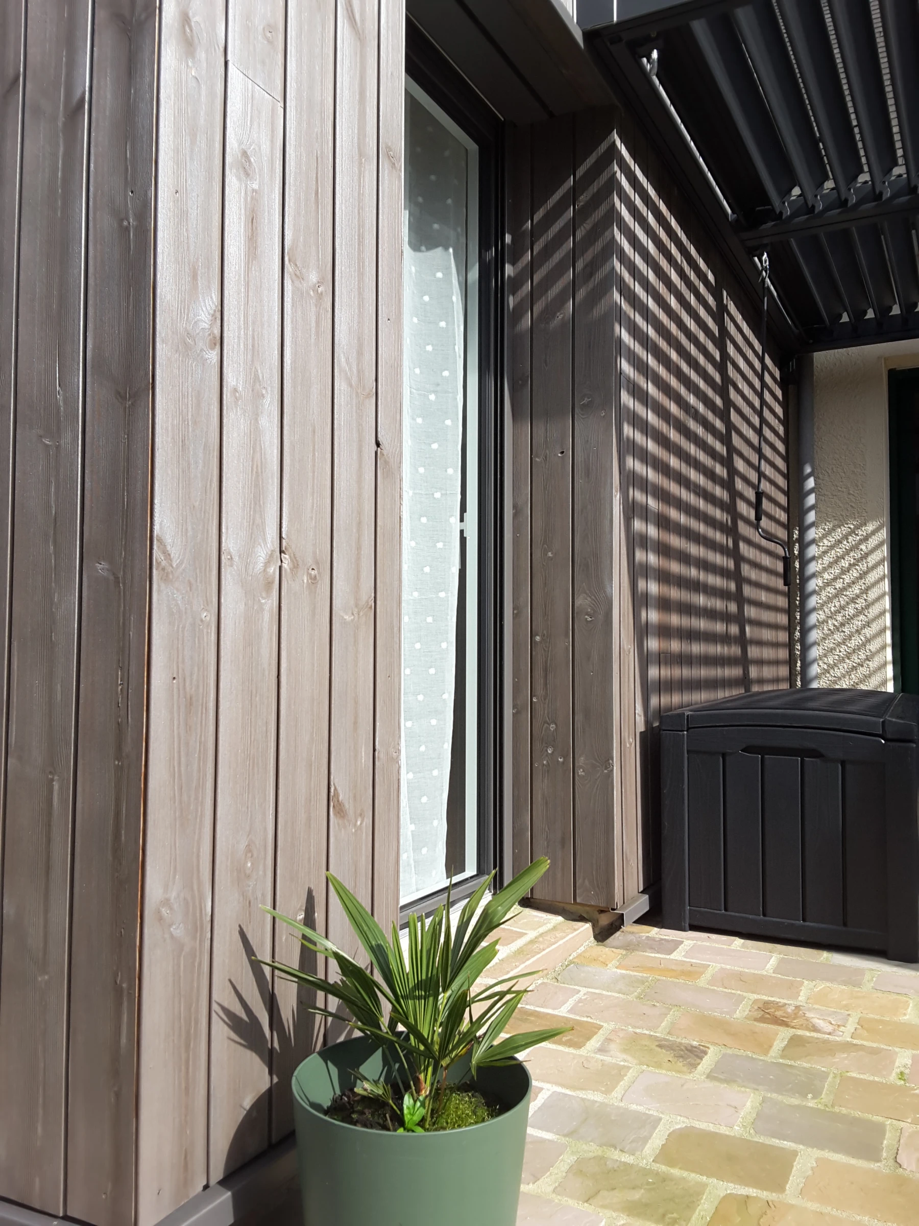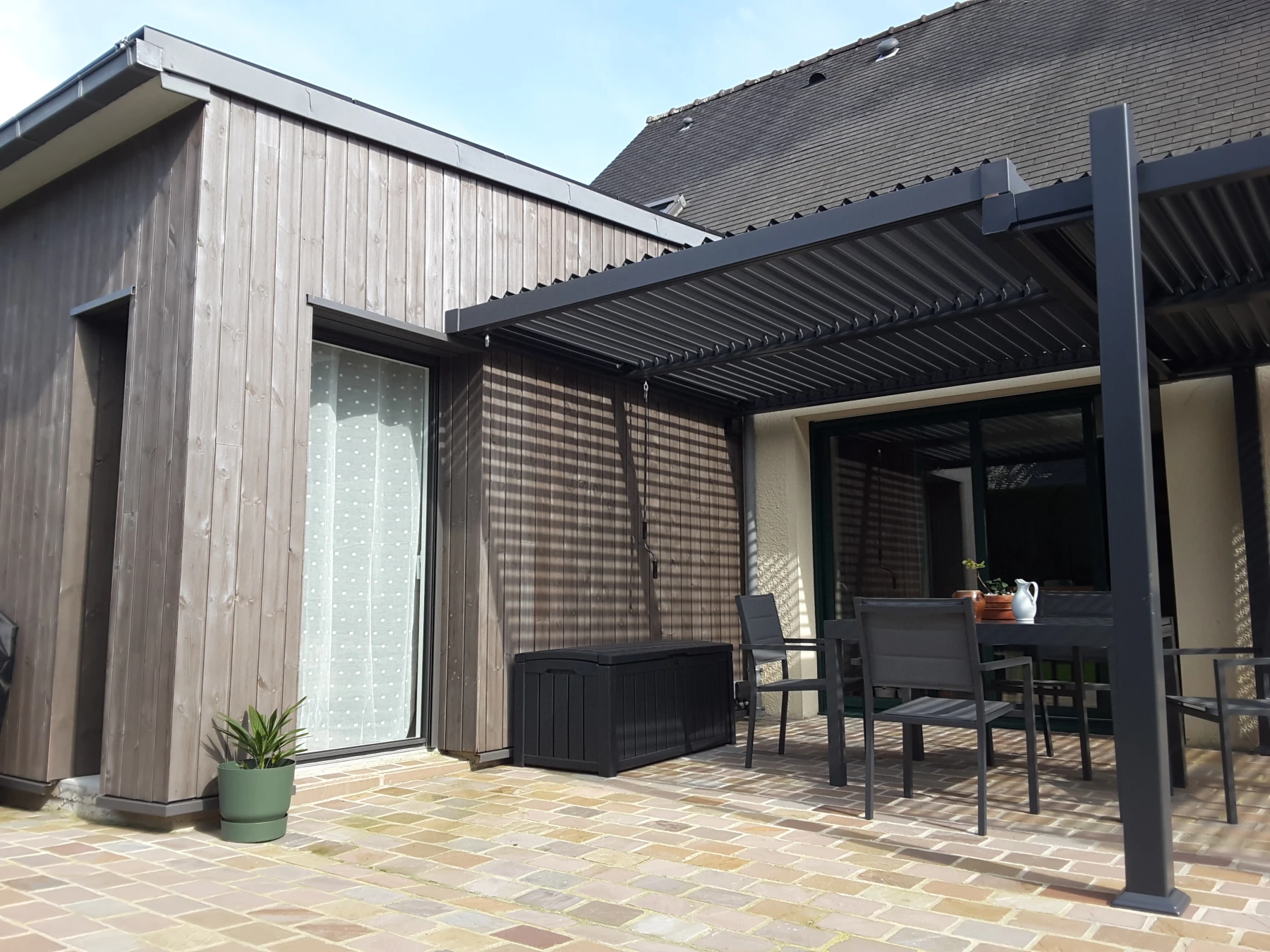 Enfin, une pergola en aluminium apporte de l'ombre sur la maison existante et permet de profiter de la terrasse, même en période de grand ensoleillement.